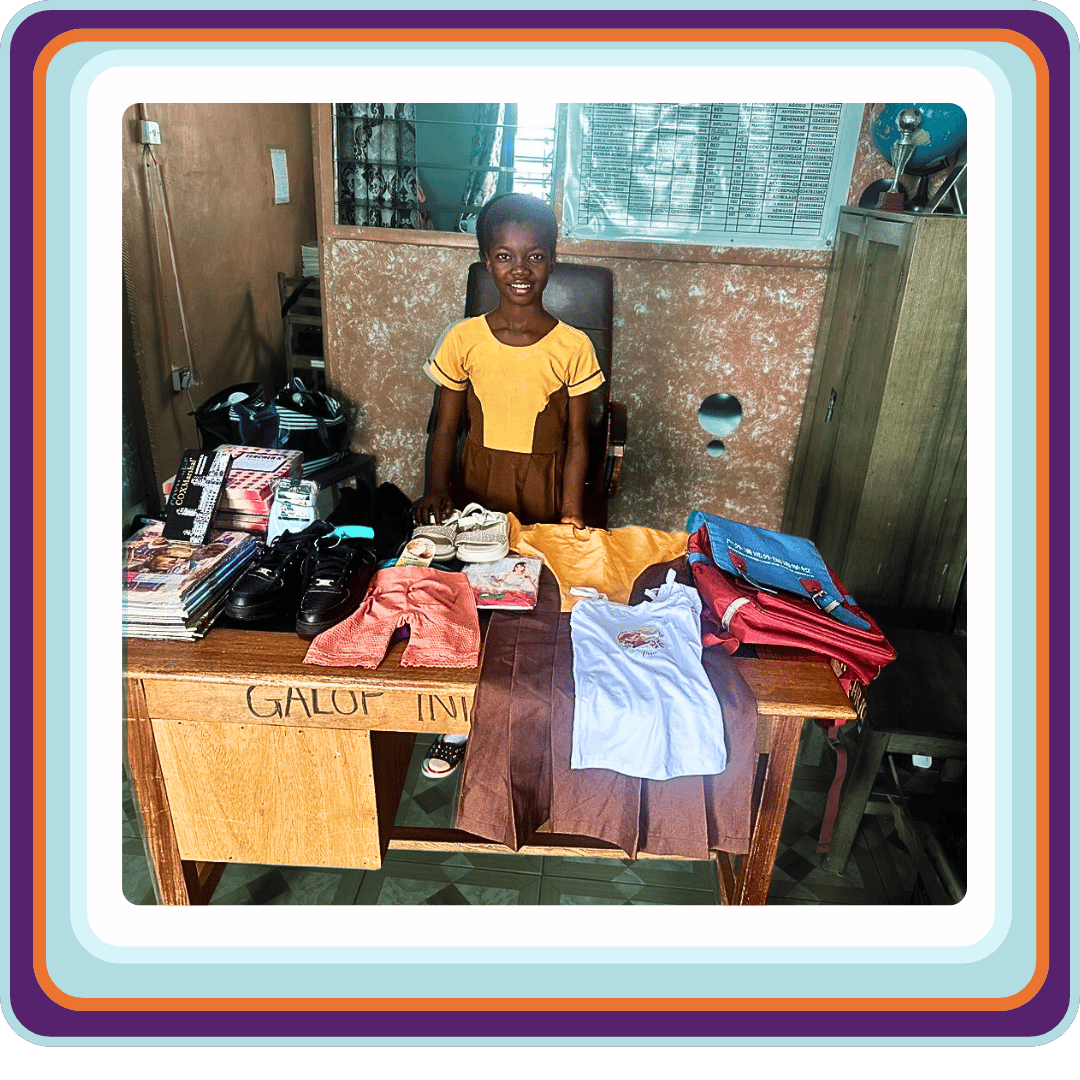 Millicent with her sponsored school supplies in Ghana.